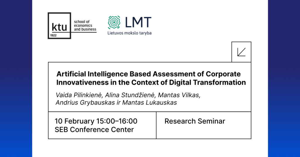 During the seminar, the results of the ongoing project funded by the Research Council of Lithuania (LMT) (Project No. S-MIP-23-54) will be presented. Seminar participants will have the opportunity to become acquainted with a unique artificial intelligence–based methodology for assessing corporate innovativeness. Based on this methodology, the Lithuanian Corporate Innovativeness Index was developed, and the impact of corporate innovativeness on the national economy was evaluated at both the sectoral and macroeconomic levels.